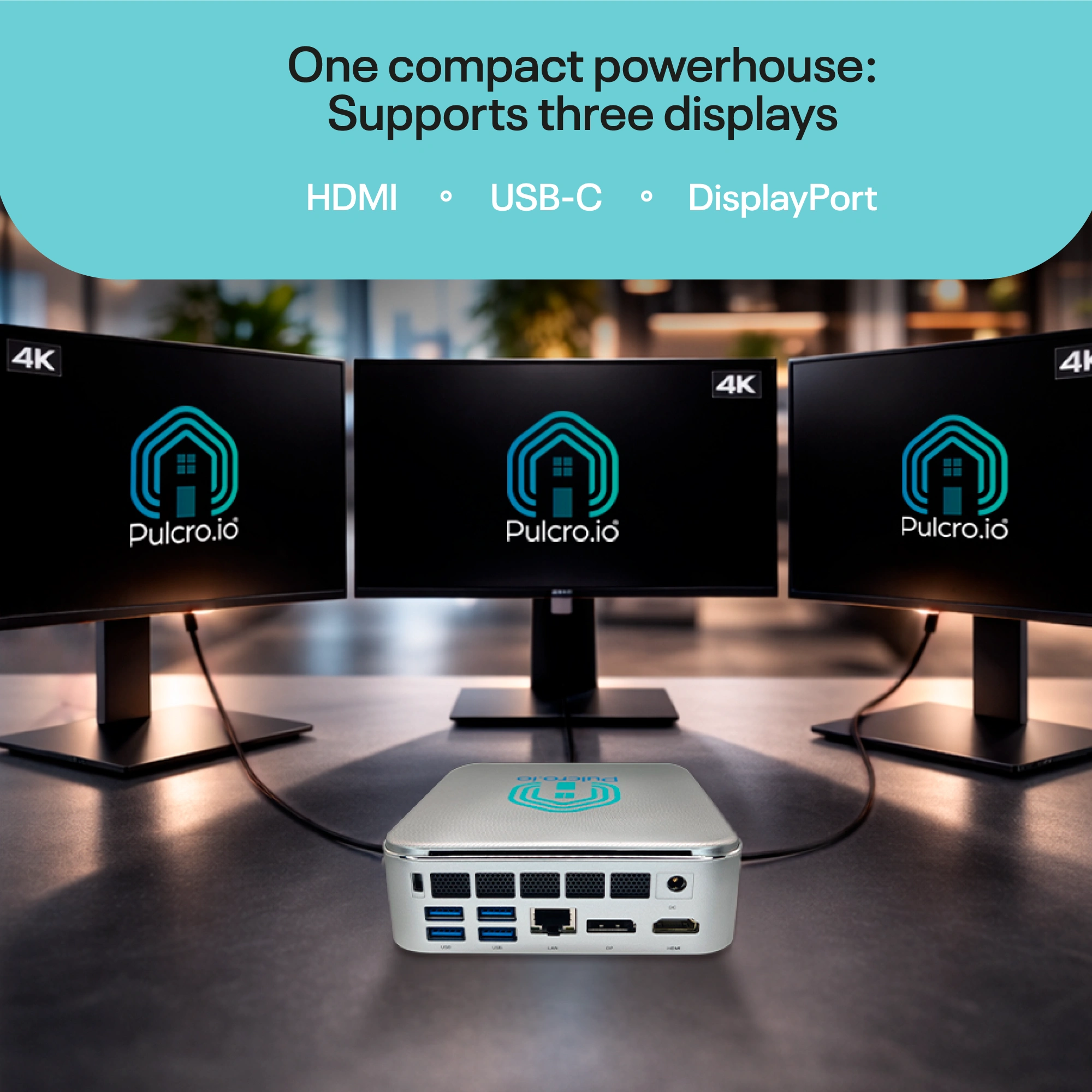 Triple 4K display support with HDMI, DisplayPort, and USB-C outputs for dashboards, workstations, or control centers.