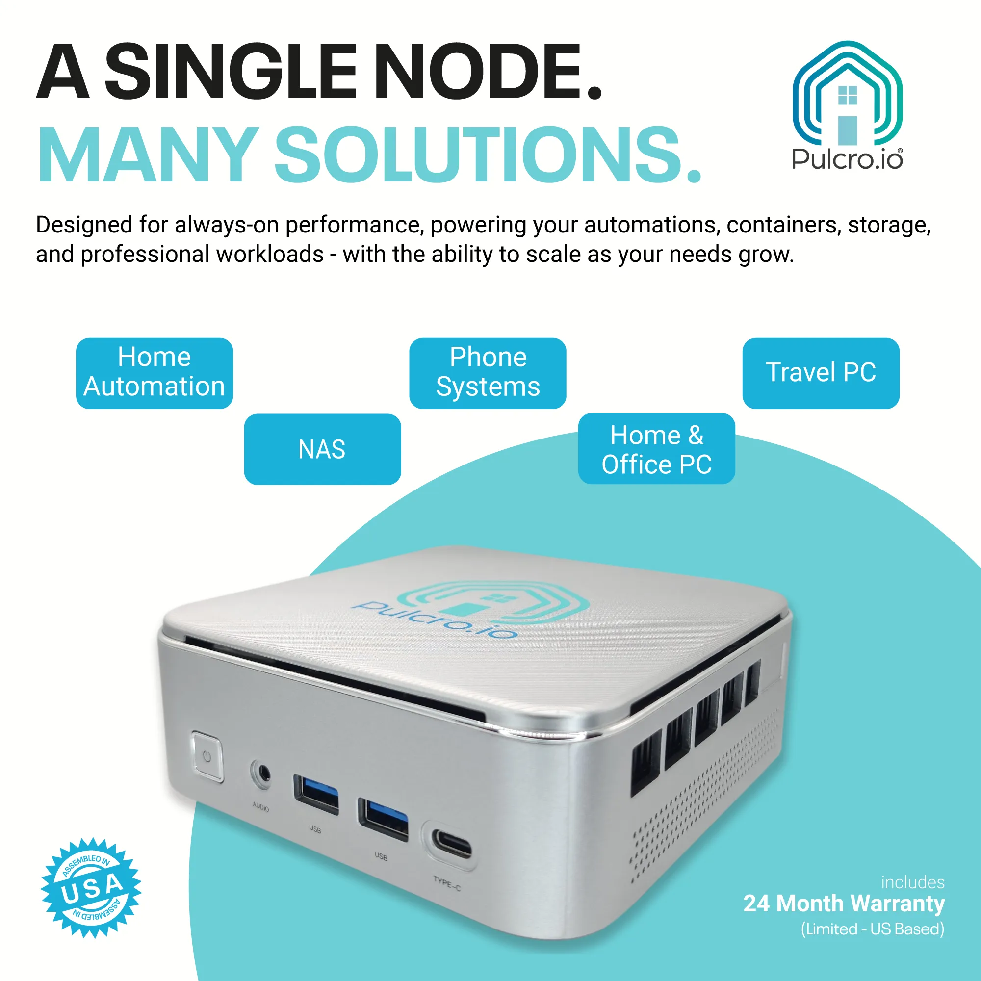 Assembled in the USA and backed by a 24-month limited warranty, the Pulcro.io TurnKey Node Mini PC is a reliable, future-ready platform built to grow with your automation, networking, and computing needs.